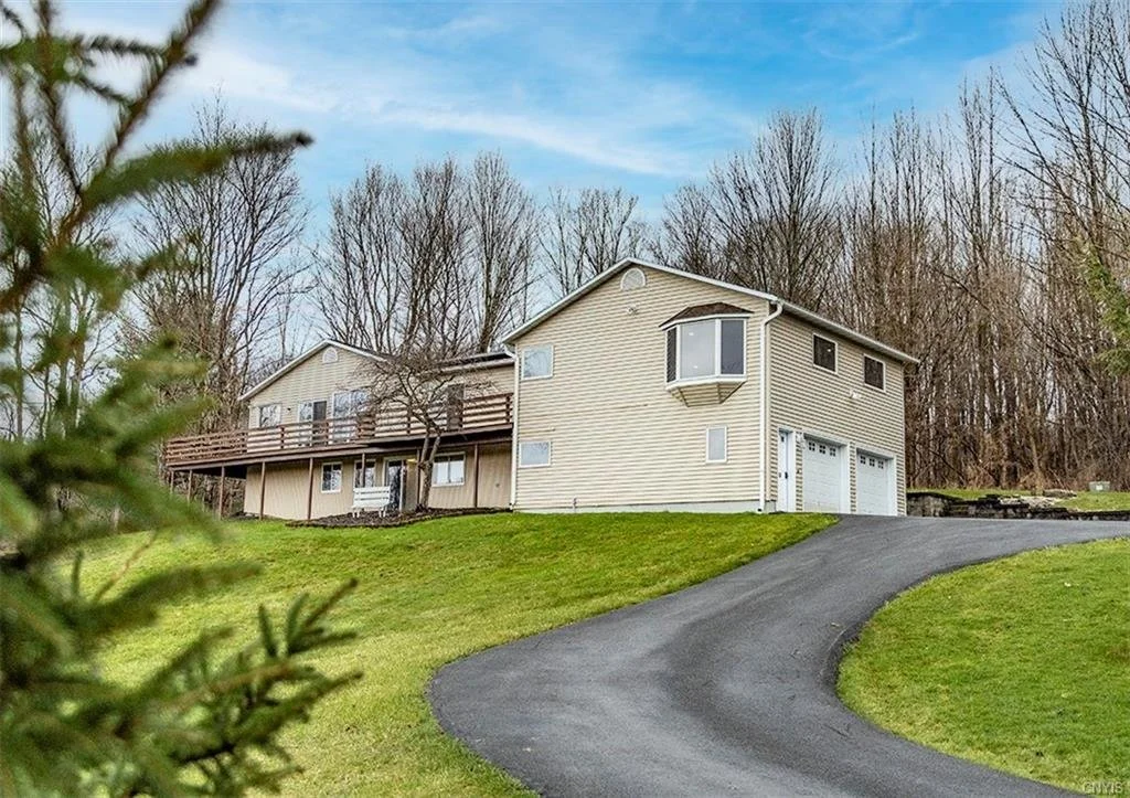 A private setting just outside the village line in Cazenovia makes this a very desirable location. Home is set on 3 acres that border Cazenovia Preservation land on two sides. It features a two-car attached garage, a 52'x32' outbuilding with new electric, and 3 bays providing extra storage for boats, equipment, etc. The new kitchen is open to a living & dining area with walls of windows and sliders to wrap around deck. It boasts new flooring, beautiful soapstone countertops, new cabinetry, stainless steel appliances, & a walk-in pantry. Island features a new sink & breakfast bar, new lighting, white subway tile, vent hood & gas stove. There is a large mudroom with separate closet sections for coats and boots. The laundry room has a door to deck & open shelving. Massive primary bedroom with gas fpl and adjoining bath. Living room with gas fireplace. There are two more bedrooms and a bath. Lower walkout level has 2 bedrooms, full bath, utility room & all new flooring. Underground fiber optics,leaf guard gutters, & dusk to dawn lights. So many improvements. Existing Solar Panel lease agreement to be assumed by new owner. Watch the July 4th Caz fireworks over the lake from your deck!