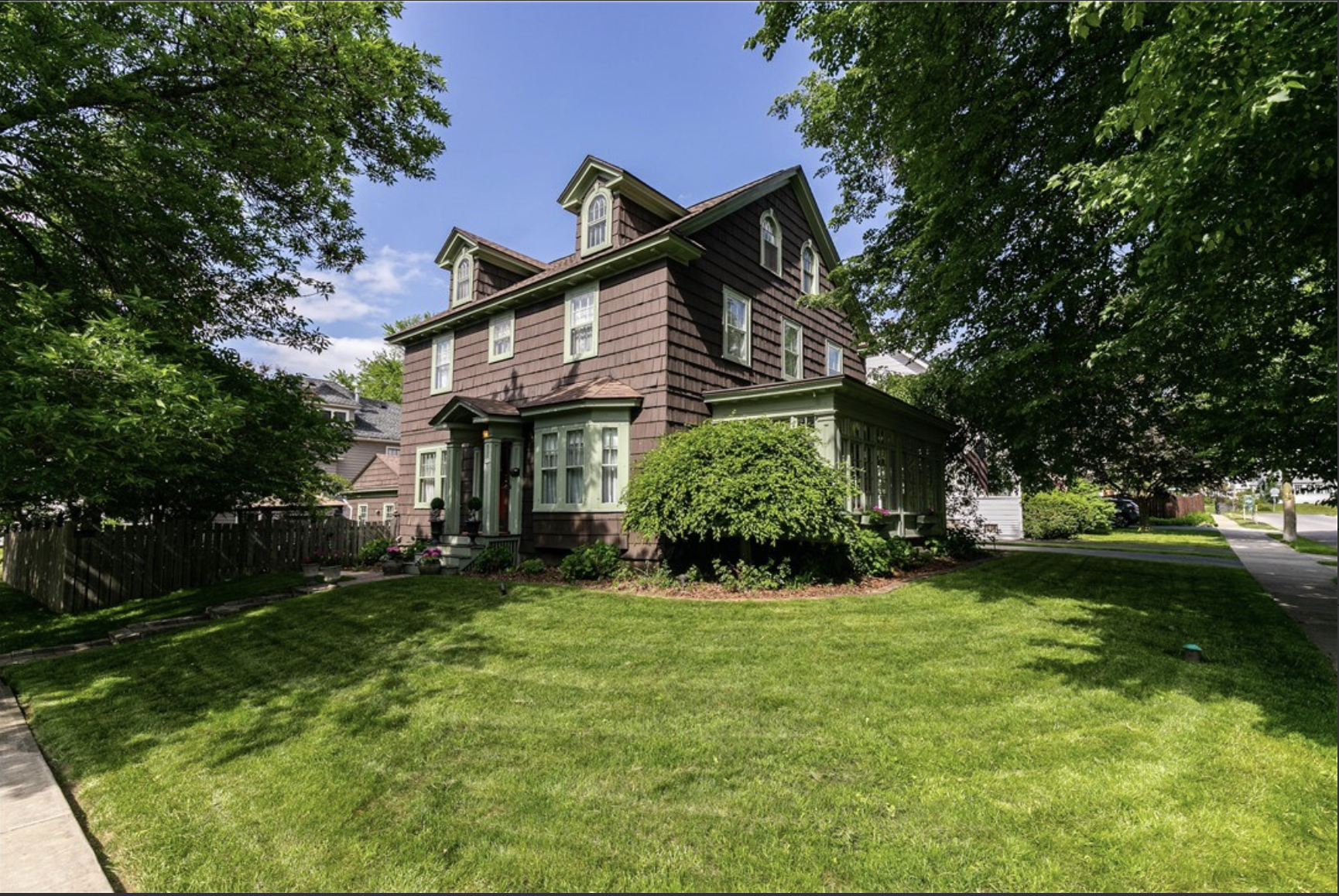 ONE OF EASTWOOD'S GEMS NESTLED ON A CORNER DOUBLE CITY LOT! This completely restored and updated 1910 American Shingle Colonial will dazzle you from the moment you walk in the door. Designer styled and move-in ready. Three floors of living space and a full walkout basement. First floor has impressive high ceilings & ornate plaster moldings and medallions throughout. Formal dining room with built-in corner cabinets and pocket doors lead into the large living room with a beautiful mantle and oversized wood burning fireplace. French doors lead you into a large sunny porch with a cozy gas fireplace for winter mornings. A lovely staircase takes you to the second floor with 4 bedrooms and a large elegant full bath and back sleeping porch. The third floor designer loft/recreation room with seven unique dormer windows and 3 chandeliers. A freestanding 3.5 car garage, full walkout basement and a manicured fenced yard with gorgeous mature seasonal gardens and a permanent gazebo. Central air and 3rd floor has a newer Mitsubishi heating/air. Newer roof with transferable warranty. Square footage includes finished attic space.